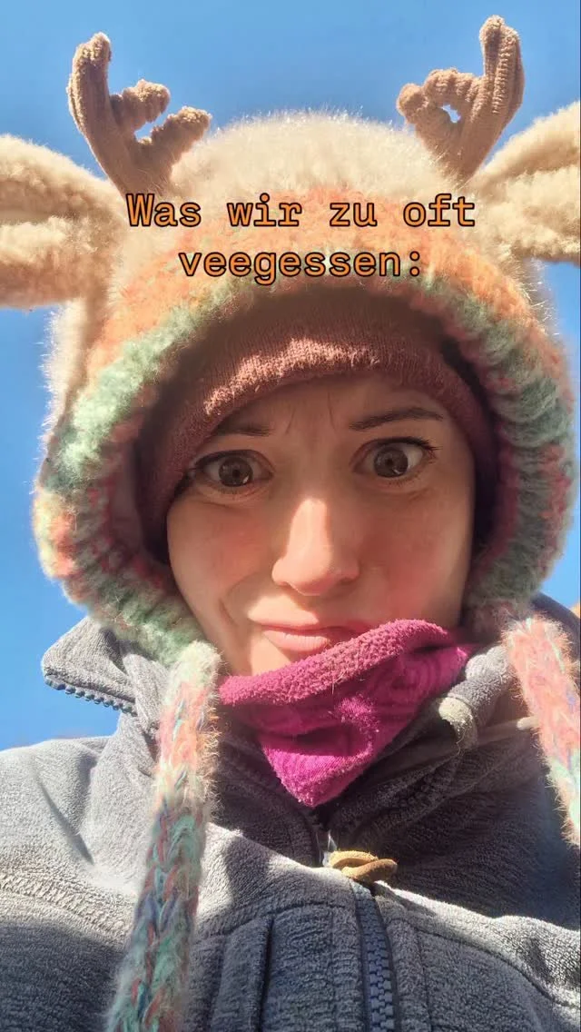 Vollformat-Portraitfoto einer jungen Frau mit Duchenne-Lächeln, Mütze, Schal und Jacke.