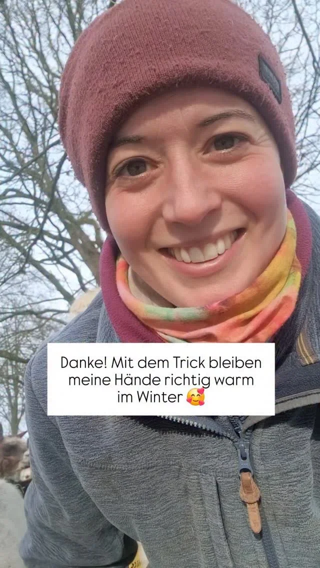 Vollformat-Portraitfoto einer jungen Frau mit Duchenne-Lächeln, Mütze, Schal und Jacke.